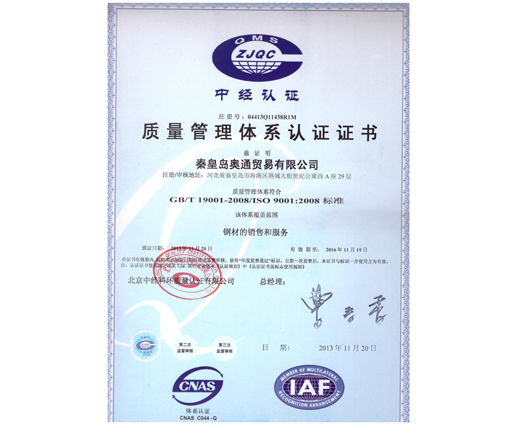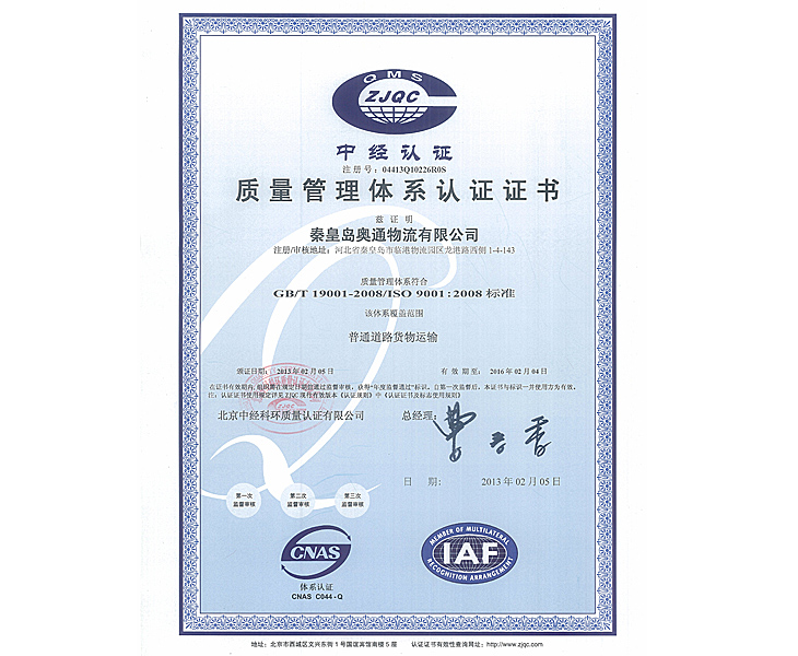 Certified quality management system certification unit